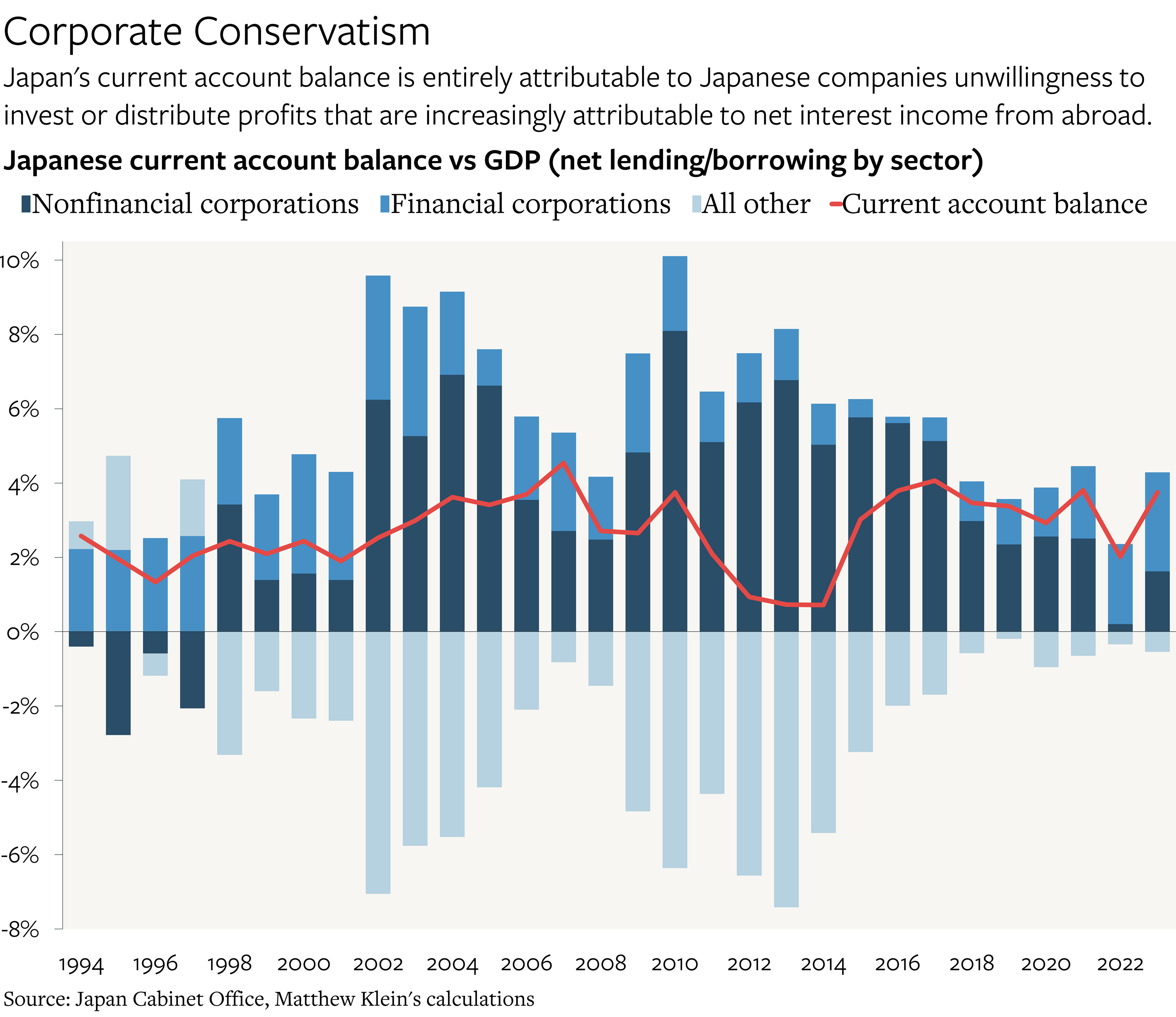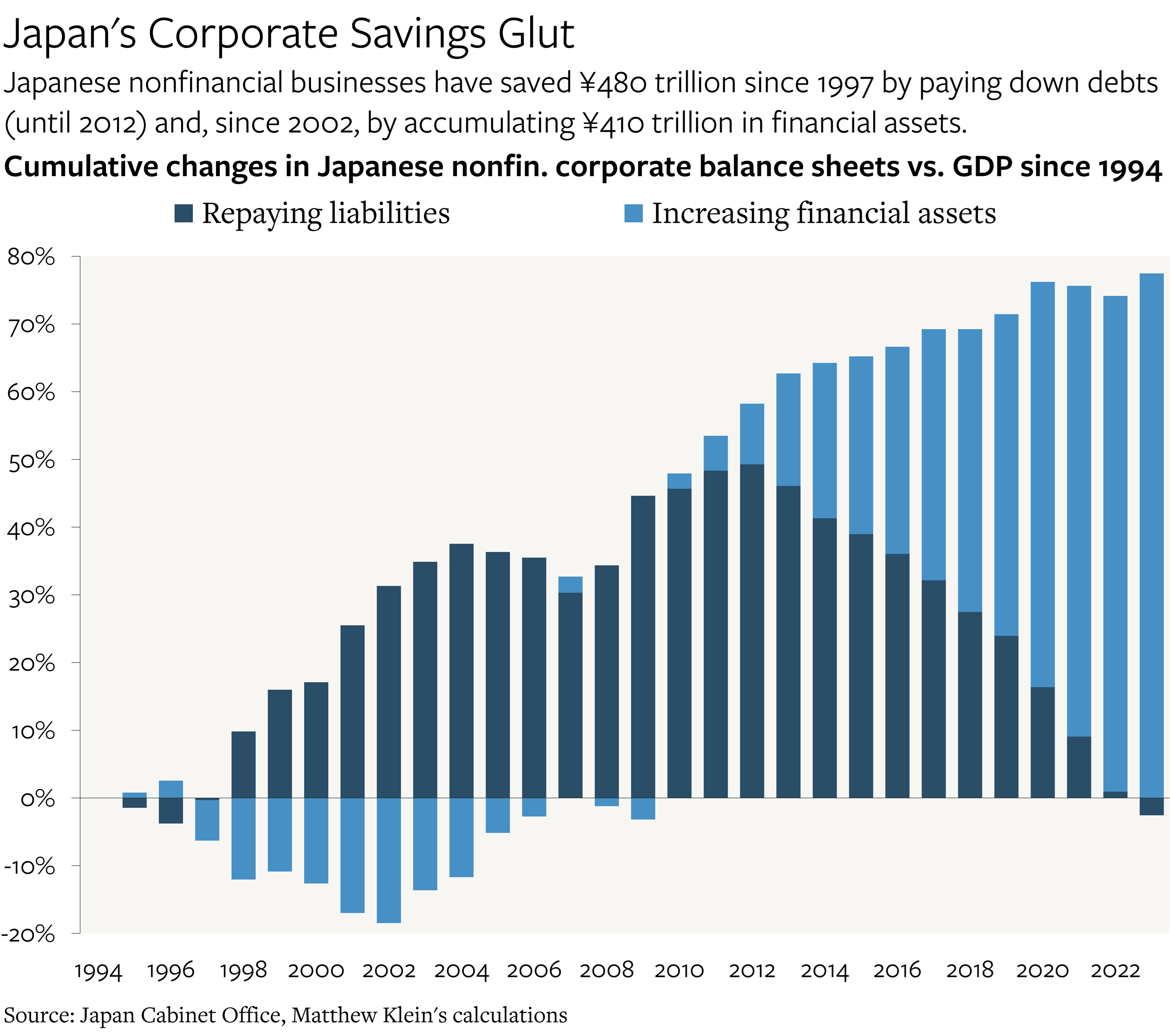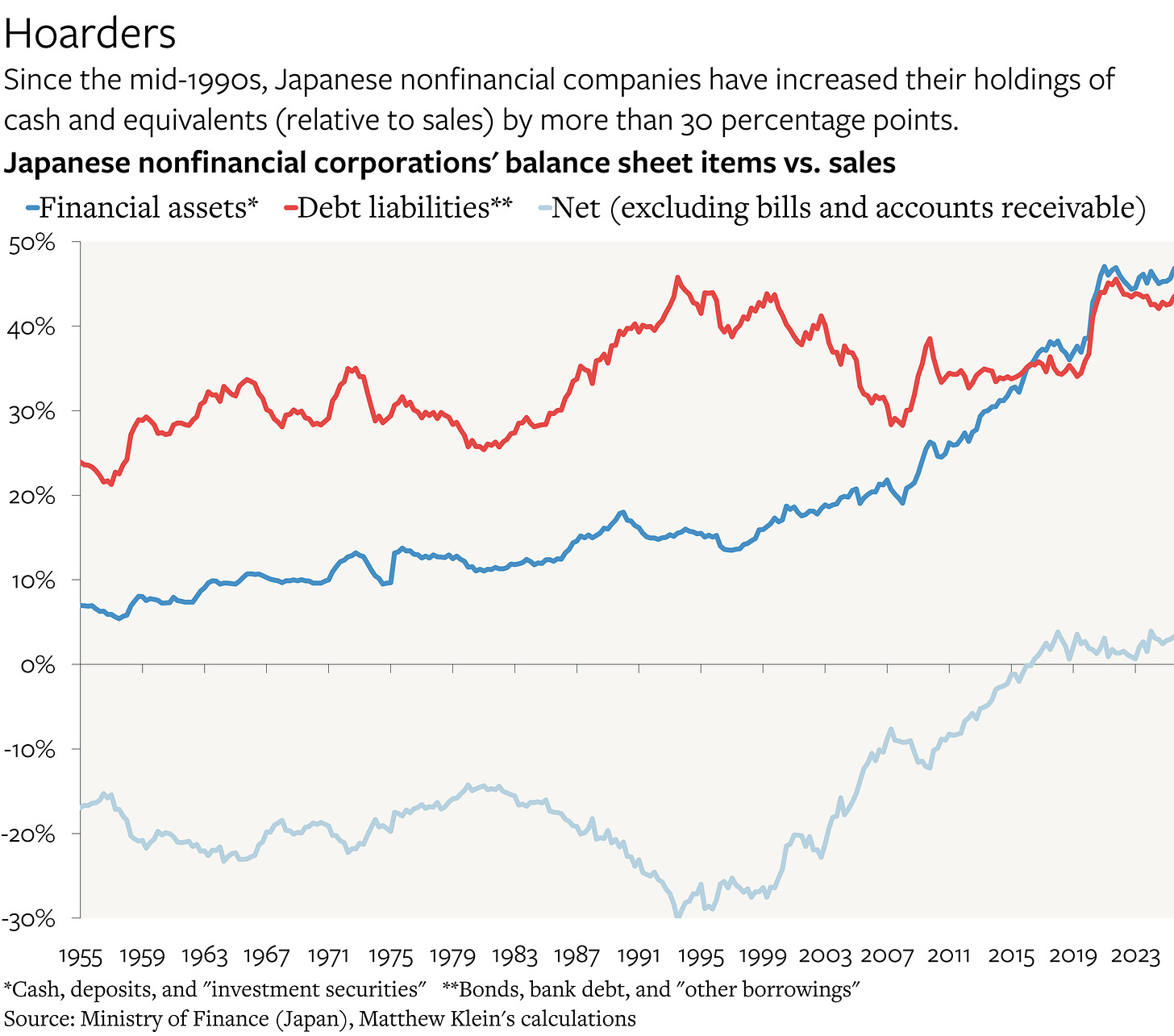 As of the end of 2025Q3, the latest available data, Japanese nonfinancial corporations held nearly 1 quadrillion yen in liquid assets, of which ~¥270 trillion were cash and deposits, ~¥233 trillion were bills and accounts receivable, and ~¥460 trillion were investment securities. Net of debt liabilities, nonfinancial corporations’ overall financial asset position relative to their total sales has shifted by more than 30 percentage points since the mid-1990s (or about ¥460 trillion). Put another way, the cumulative net saving of the entire Japanese nonfinancial corporate sector over the past thirty years is currently worth about 80% of Japanese GDP.