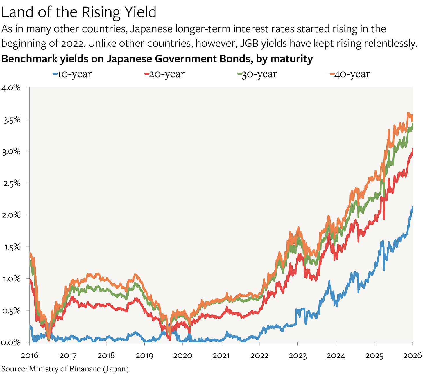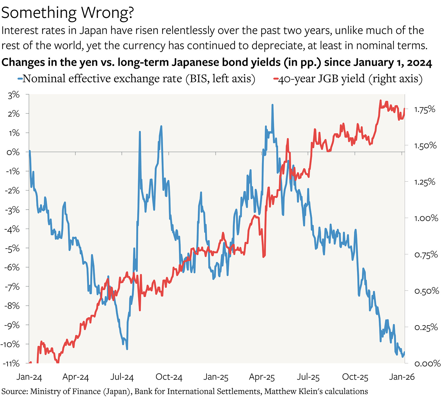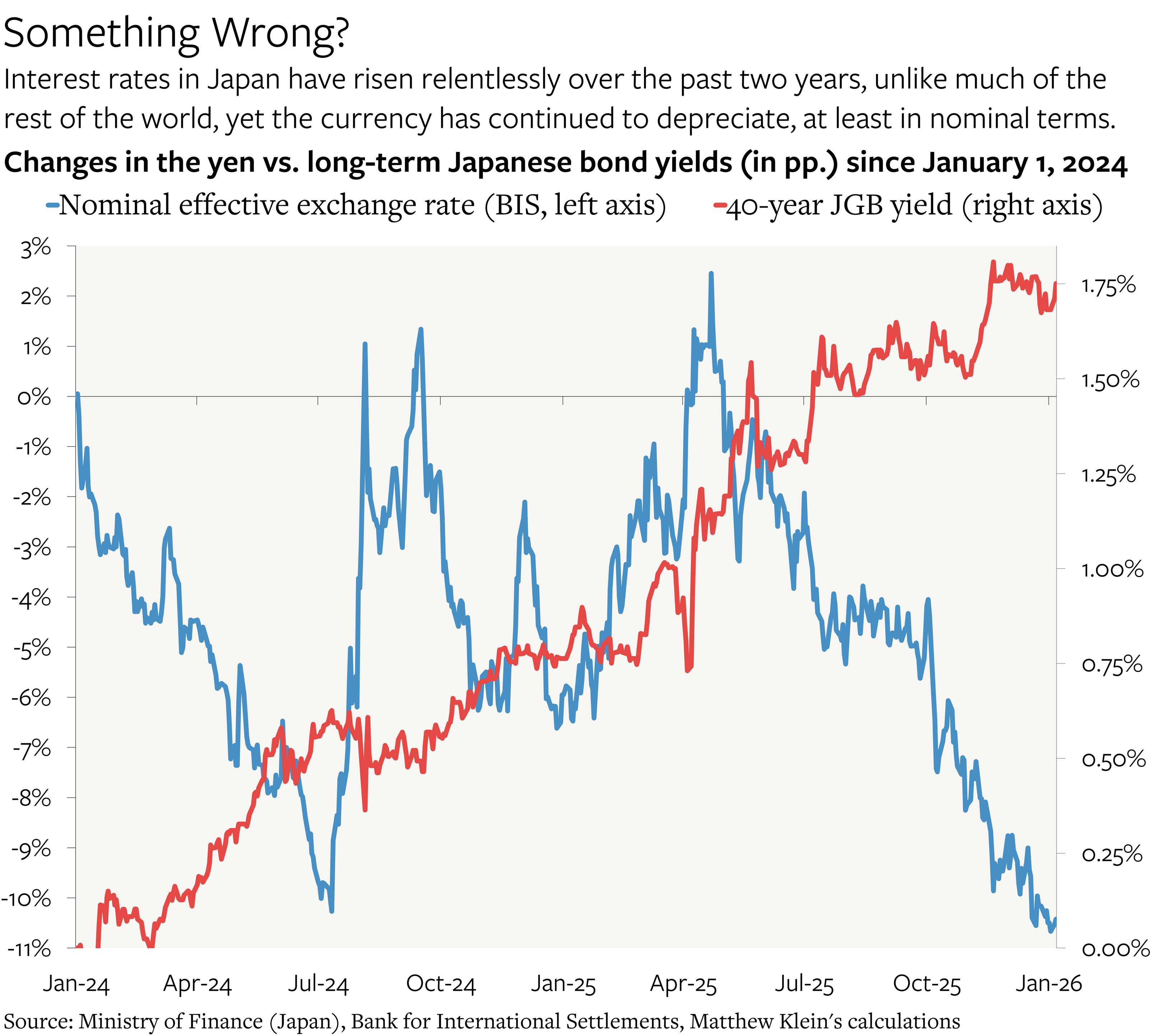 Those who believe that the debt is unsustainable believe that the government will eventually be forced to choose between outright default and “debasement” that would cheapen nominal yen claims relative to assets in other currencies as well as relative to real assets. For those who have spent decades warning—or scaremongering—about Japanese public indebtedness, the persistent (nominal) weakness of the yen in the face of rising (nominal) interest rates over the past few years therefore seems like vindication that this process is finally starting.