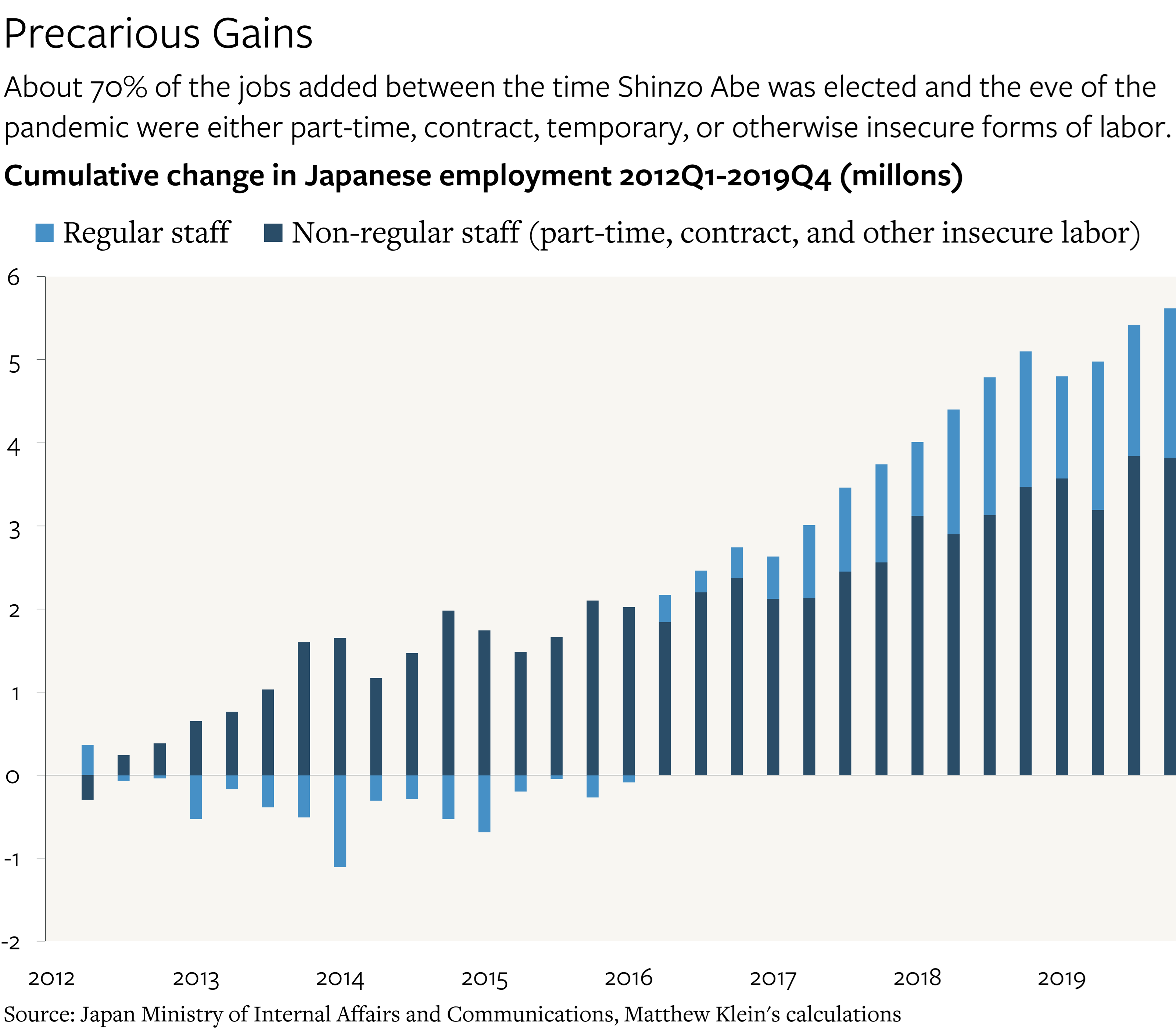 Similarly, while employment had boomed, particularly among women and the elderly, the gains were overwhelmingly in precarious part-time, contract, and other “non-regular staff” positions.