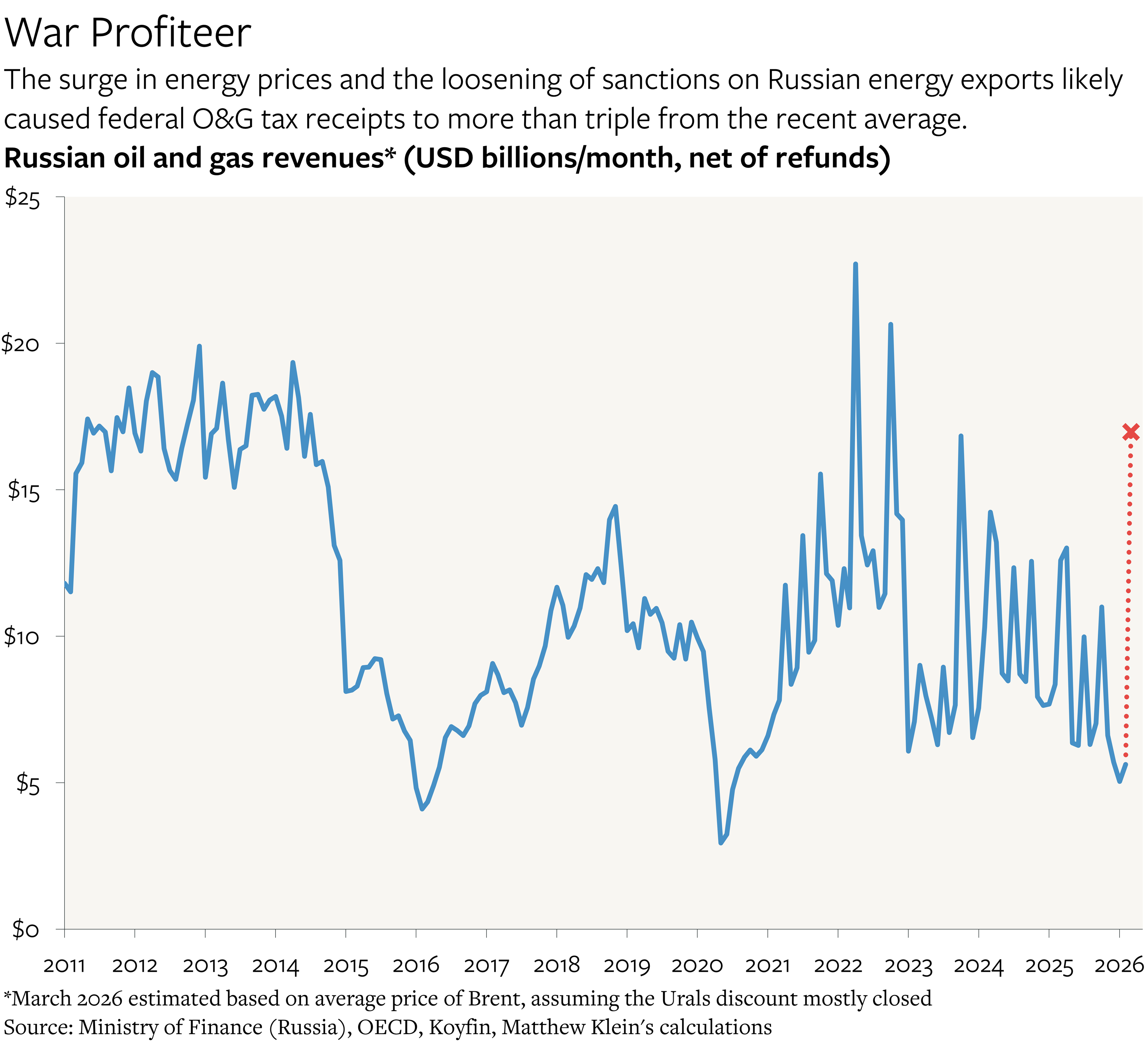 At current prices, the Russian government’s energy-related tax revenues are probably running about 3x the monthly average from December 2025-February 2026. If those prices hold for the rest of the year, total oil and gas tax receipts would be worth about $180 billion in 2026, up from $101 billion in 2025.