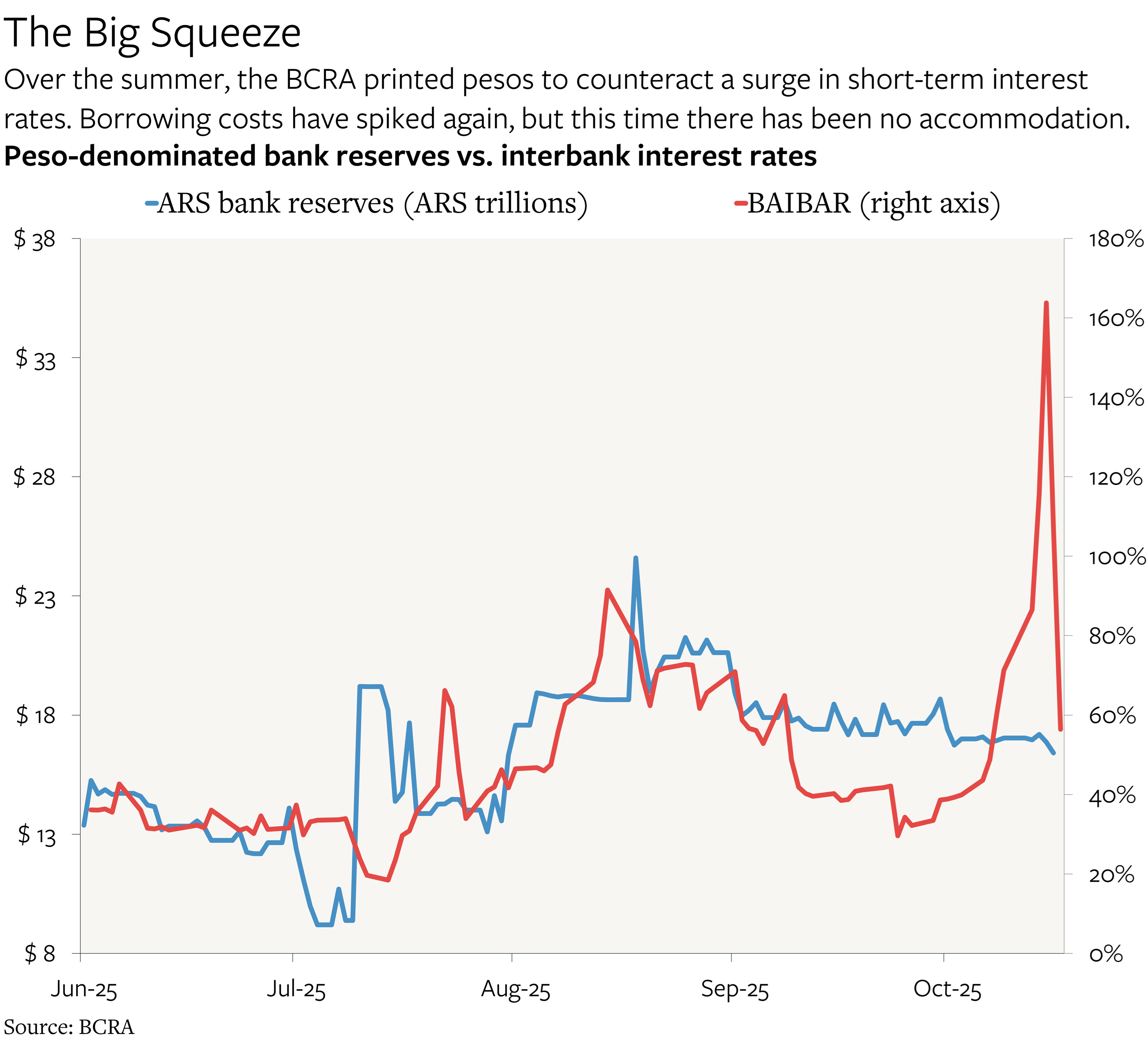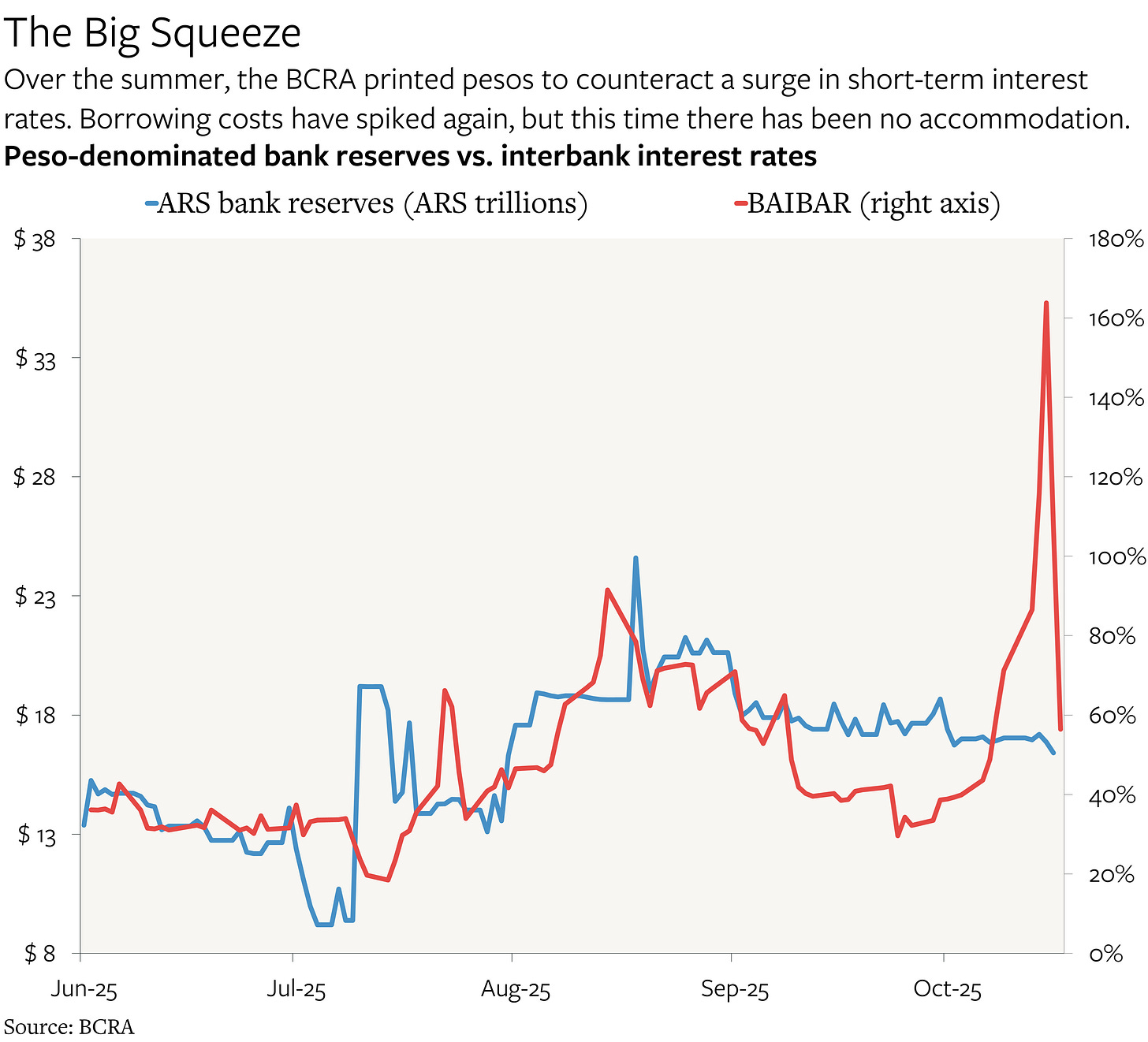 Argentina is in trouble. The short-term interbank interest rate benchmark (BAIBAR) had spiked to 165% last Wednesday, up from 40% at the beginning of October. Unlike over the summer—the last time borrowing costs spiked—Argentina’s central bank (the BCRA) did not relieve the pressure by printing peso bank reserves.