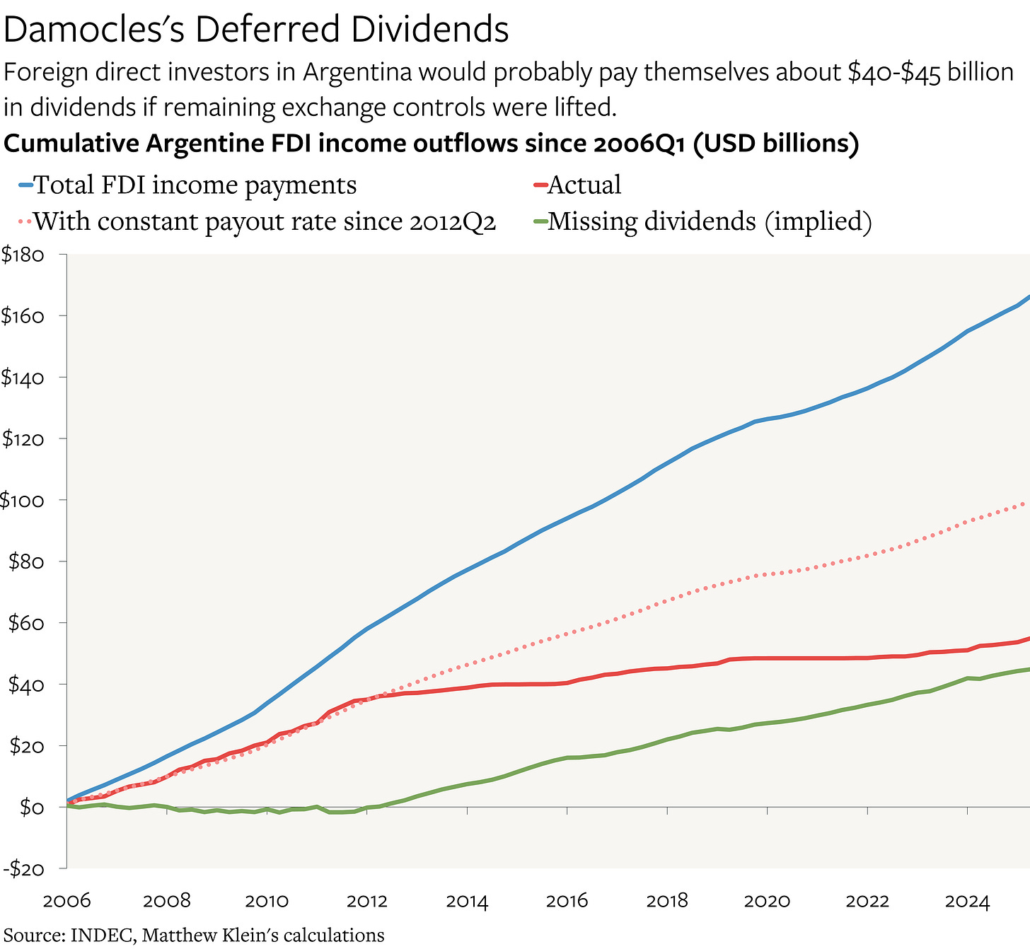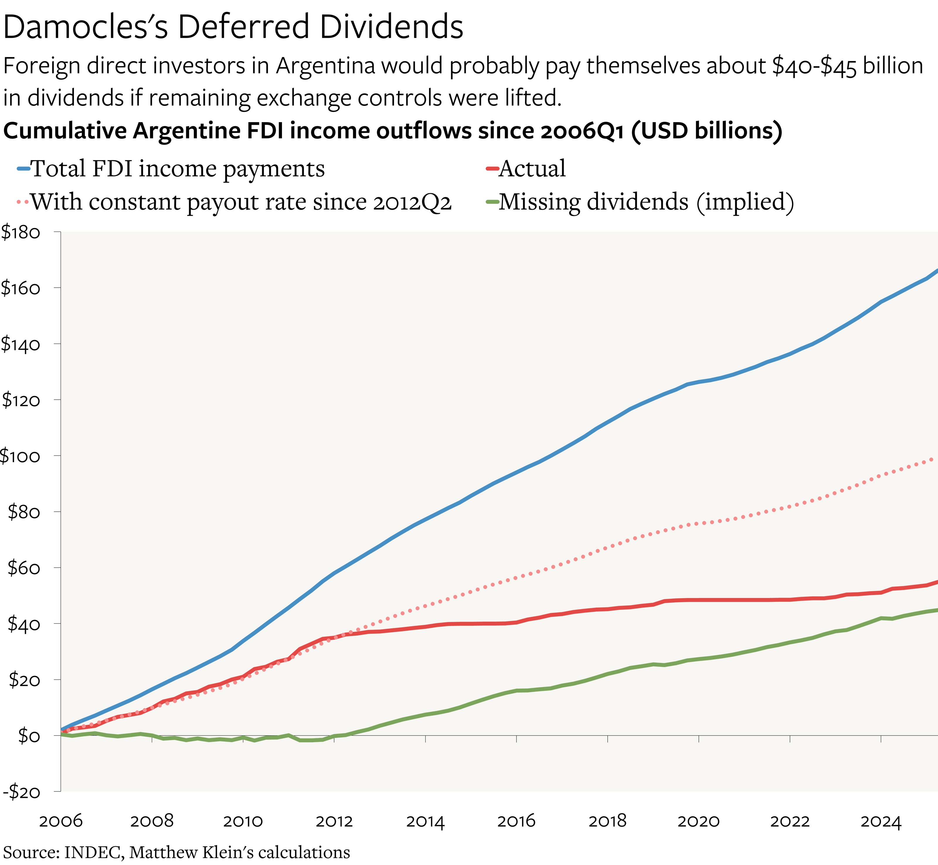 As a first approximation, there are about $90 billion of private sector Argentine bank deposits denominated in pesos that have yet to be converted into hard currency or pulled out of the banking system entirely, plus around $43 billion of unpaid dividends owed to foreign direct investors.1 Argentine officials are well aware of this latent pressure on the currency, which explains why they still refuse to let companies pay dividends out of retained earnings generated before this year.