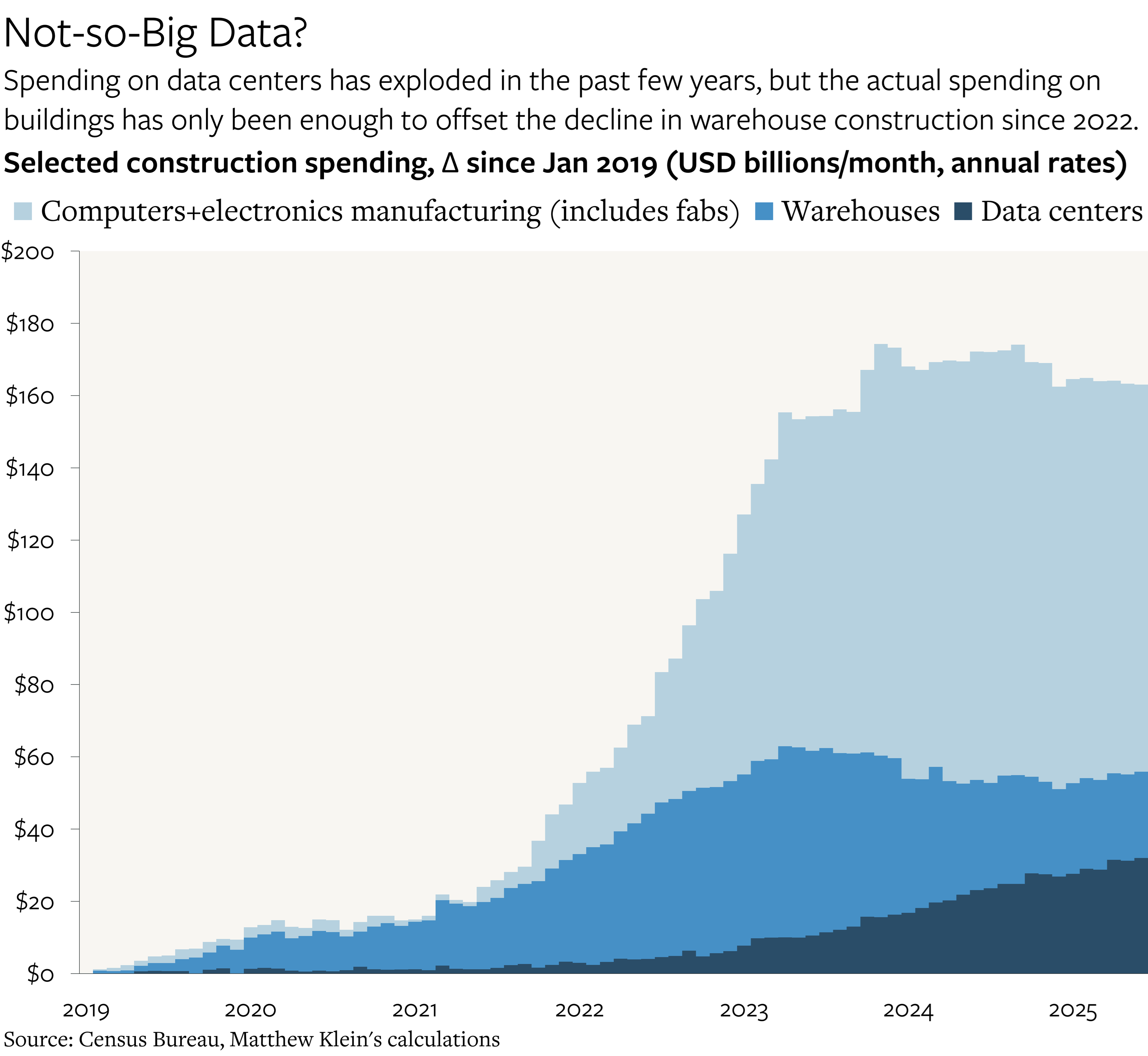 Most of the BEA’s estimates of nonresidential structures investment ultimately come from the Census Bureau. The Census has monthly estimates of construction spending on data centers going back to 2014, although the numbers are only available in the depths of downloadable spreadsheets. Data center construction is bundled inside the broader category of “office”, presumably because office buildings and data centers are both climate-controlled buildings with lots of computers inside. The growth in this category has been extraordinary over the past few years, but it started from a very low base. The numbers reported by the Census make clear that it has only been sufficient to offset the slowdown in warehouse construction, which had surged during the pandemic-induced e-commerce boom only to normalize in the years since. Spending on new chip fabs dwarfs both.