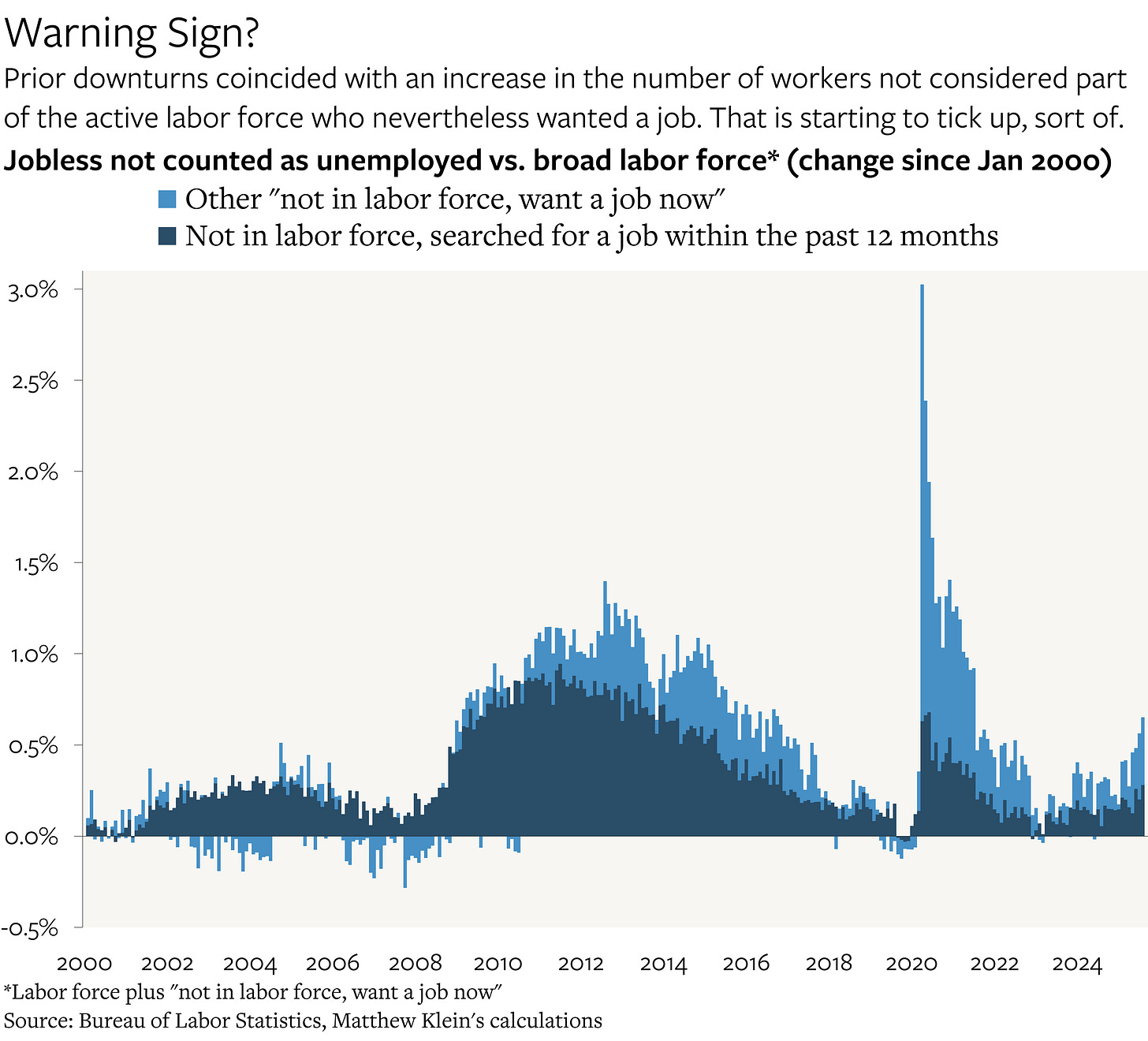 By definition, if prime age employment has been stable at the same time that U-3 has been rising and at the same time that workers have been dropping out of the labor force, job market weakness must be concentrated elsewhere. Specifically, Americans under 25. While jobless rates for the 16-24 age cohort have historically been both higher and more volatile than for workers with more experience, that does not explain the relentless surge since the beginning of 2024.2 And even though there are far fewer American workers in that age bracket than in the 25-54 or 55+ categories, the magnitude of the unemployment rate increase has been big enough to affect the aggregate numbers, particularly when it comes to unemployment by people who are either new to the labor force or who are re-entering the labor force after taking time off from job search.