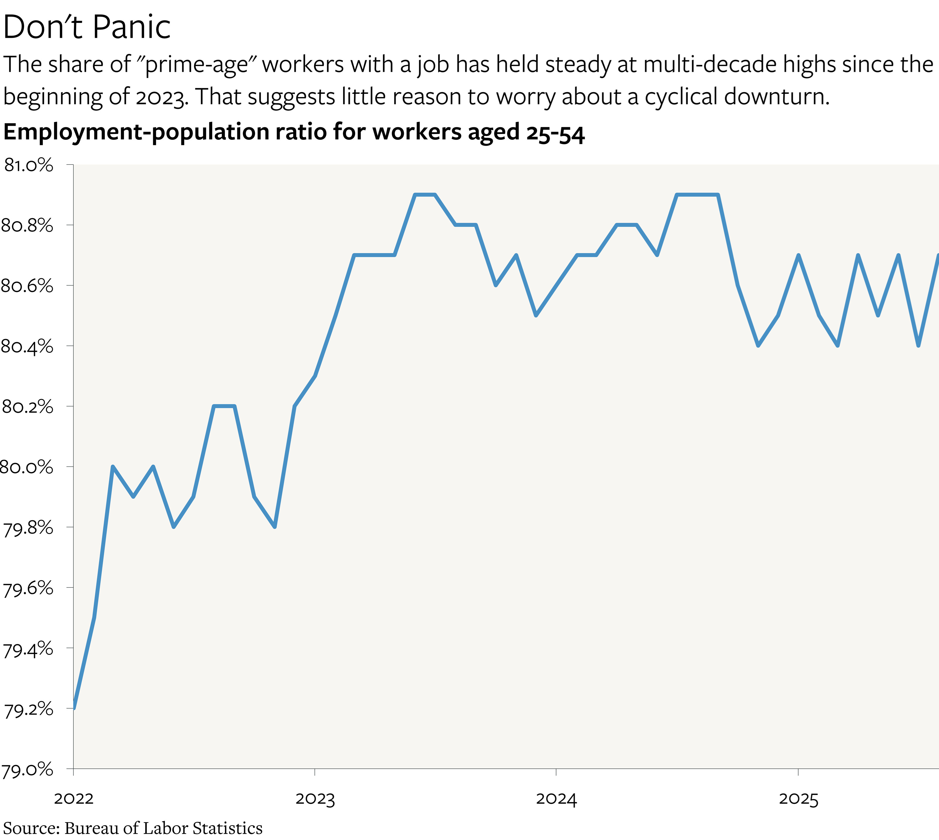 The single best indicator of job market health is the share of workers aged 25-54 who say that they have a job. This measure is insensitive to longer-term trends in education and retirement preferences, and it is also immune to confusions caused by changes in whether people are officially classified as “unemployed” or “not in the labor force, want a job now”. This measure was quicker to catch both the downturn of the early 2000s and the financial crisis. It also did a better job of capturing the persistent job market weakness following both of those episodes than the headline unemployment rate (also known as U-3).