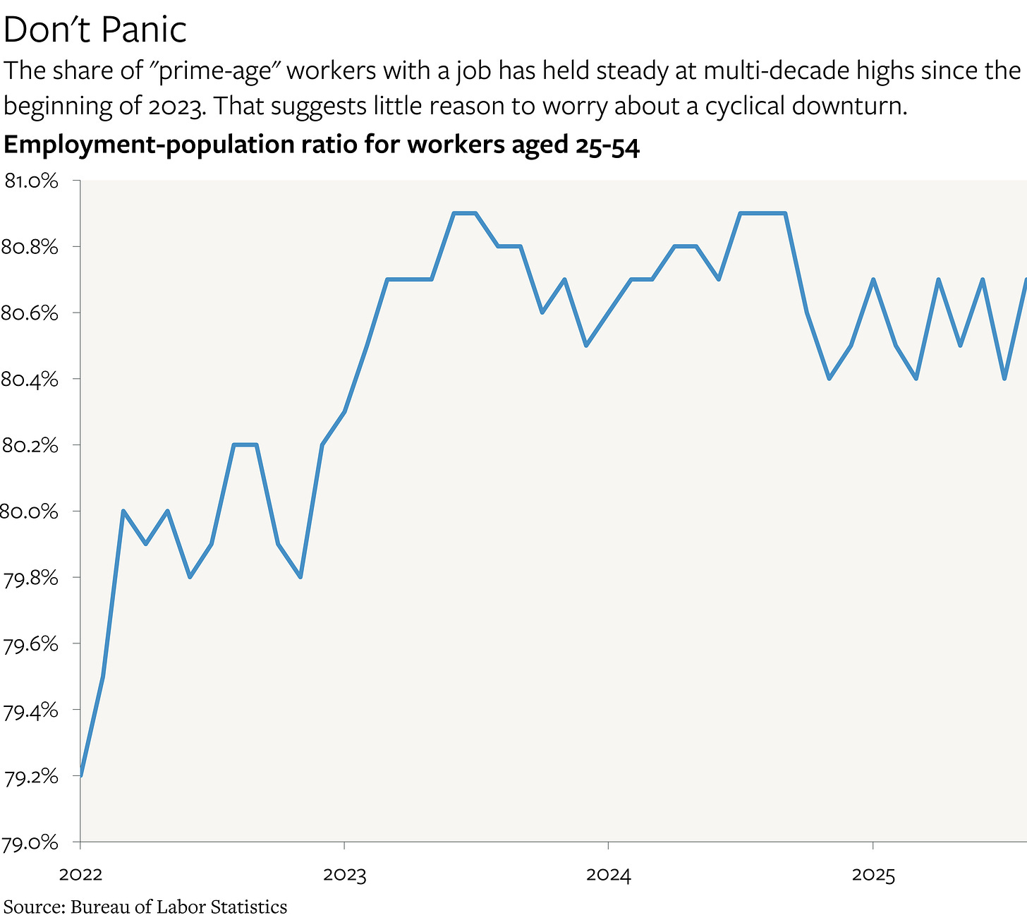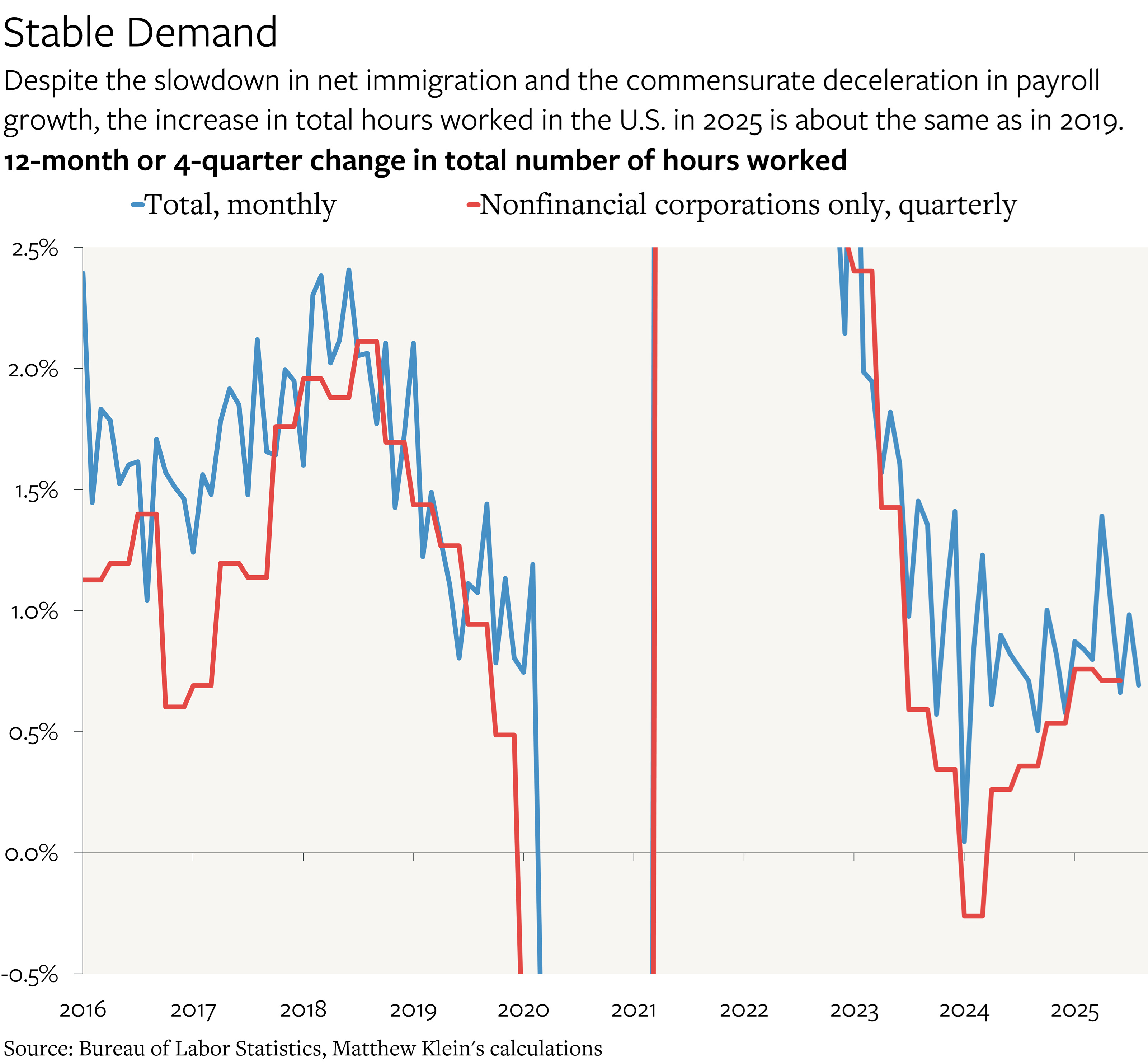 This reflects healthy demand for labor, because the total number of hours worked has been rising in 2025 (0.65% annualized) at about the same rate as in 2019 (0.75% annualized), even though the growth rate in the number of payroll jobs has been about half as fast due to the sharp swing in net immigration.